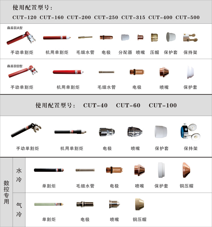 注○3:CUT-315型以上配件,制造結構獨特,電極采用“全方位”水冷卻,噴嘴采用“增壓式”,與其他型號配件不能互用,選用時務必請注明型號。